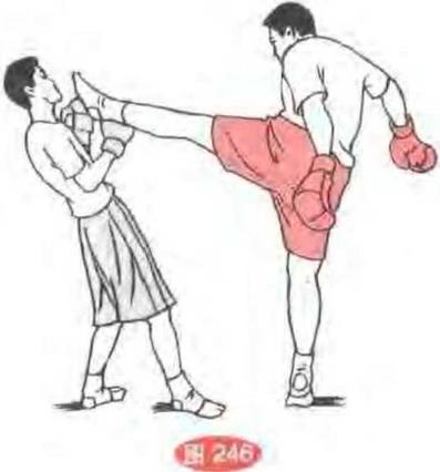 13左追肘——右上顶膝——左飞蹬腿双方对峙我先发左追肘击打其胸部°(图244)接着用右顶膝顶击其胸肋0(图245)然后再用左飞蹬腿蹬击其头部重创对手。(图246)