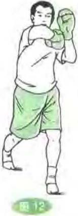 (1)平肘由防卫姿势开始一手臂屈肘肘尖由身体左、右两偏弧形向体前平摆力达肘尖另一手臂挡护在面侧脚趾蹬地转腰拧胯送肩甩肘目视肘方。(图12)