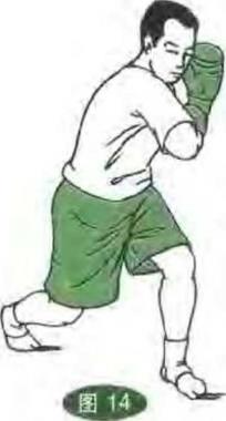 前下方斜劈身体重心下降含胸滚背屈膝沉胯力达肘尖另一手臂屈肘挡护在面侧目视肘方。(图14)