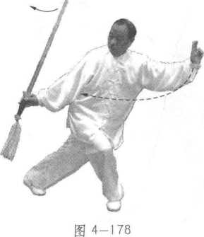 上崩剑后随即指剑手收 至右胸前,挥动指剑手向下、 向左后、向上带动上身向左转 270度。同时剑尖向上、向左、 向前随着最后的弓步定型向前 立刺剑。左臂向左上撑起,指 剑手掌心向上,指向头顶。面 向西,目正前视(图4-178? 图 4-181 ) o