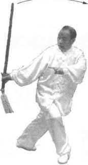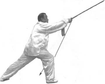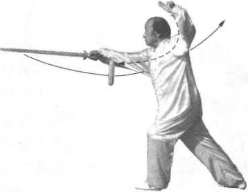 先起动左臂,以左臂带动上身旋转,再以上身带动右臂持剑 旋转前刺。
