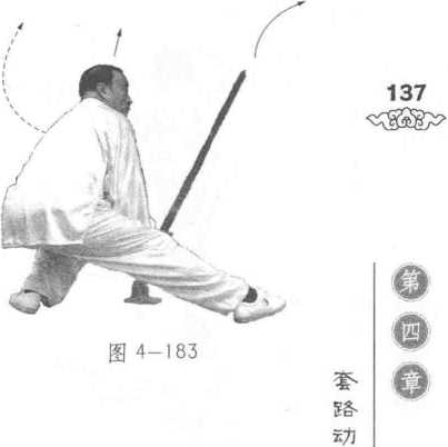 重心后移,右腿伸直, 左腿尽力下蹲,臀部下坐成 右仆步。右掌正握剑,下落 至右腿内侧,立剑斜对前上 与地面相交成45度。指剑 手掌心向下护于右腕内侧, 面向东,目视前上方(图 4-183) o