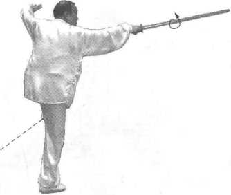 蹬腿独立站起,要力发于前脚掌至腿再至腰胯一气呵成。 独立站起刺剑要用上左臂后上撑的力量,才会快捷有力。