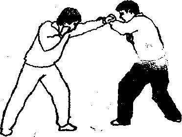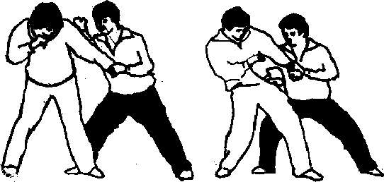 (2)敌并以左拳向我面部袭来(或我以前手诱击敌面尸敌必招架)我则乘势采拿其左腕并顺其啬冲之势将其向我体左后傀牵拽(此技在武林中称之为引进落空或顺手牵羊)(图1—183)