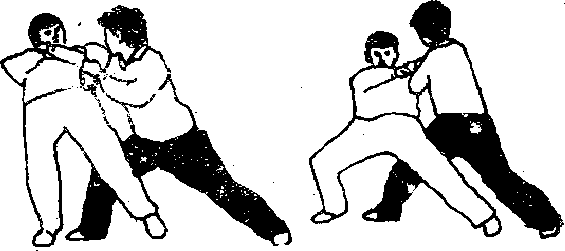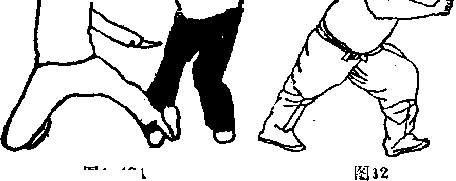 即左脚略向左侧闪挪同时右手随左闪之势将敌向右侧牵摔右脚随左闪之势向左侧勾挂敌左腿使其跌倒(图1-11