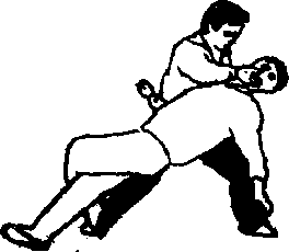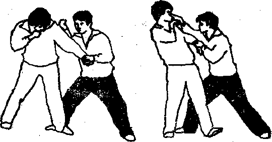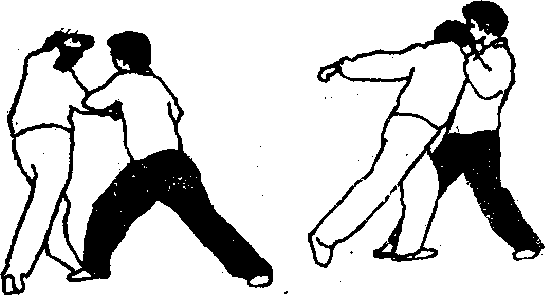 我以双军跌跌敌敌如顺势拧转向我拧靠(图1-18),我可就势以左掌托住敌后脑同时以右手托住敌下颌速即腰身左拧左脚后挪两手随左转之势作反向搓扭襁敌颈椎错位(图1—188)