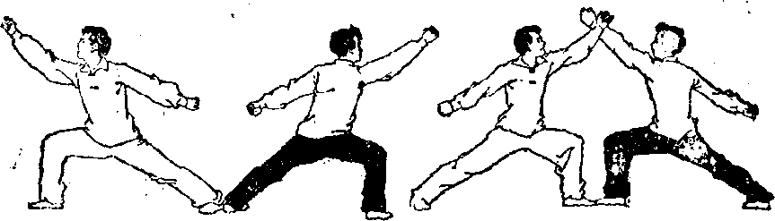 甲、乙二人身体均左转,仍为左弓步;同时甲左臂用力 将乙的左臂压下,摆至体后,拳眼向上,右拳由后经上向前 直臂抡劈乙头部,拳眼向上,目视对方头部。