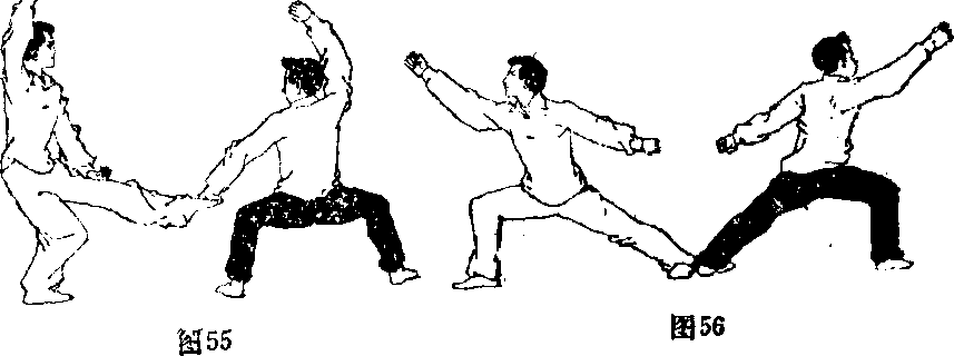 甲左腿由身后屈膝提起,向前弹踢对方腹部,脚面绷 平,脚底向下;同时左拳从前向后,臂外旋,屈肘收于小腹 前,拳心向上;右拳仍架于头上方;目视左脚。乙身体迅速右转,右脚后撤一步,两腿屈膝,成马步> 同时左拳变掌,从上向下用力拍击甲左脚面,掌心向下;右掌变举,从前向下、向后、向上弧形绕行,"屆肘架于头上方,: 拳眼向下,目视左掌(囟55)、' 第六路下崩