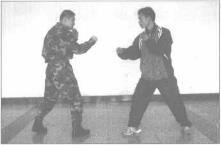 我与对手保持一定的距离展开格斗(图885),当对手以右摆拳向我头部攻击时我左手迅速格挡右掌猛击其面部将对手失去反抗能力(图886)。