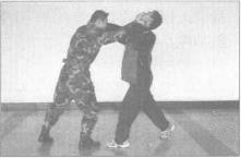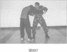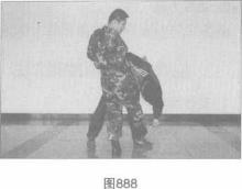 左手迅速抓其手腕、拉臂同时右手屈臂肘击对手心窝(图887),右手从对手腋下穿过猛力上挑、拉拽的同时身体突然向右后转身随即右脚勾踢对手的支撑腿脚踝处将其摔倒(图888)。