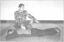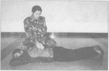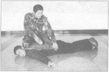 倒地后右脚迅速踹击其颈部使对手失去反抗能力(图889),迅速抓握其右手腕右膝盖跪压其颈部左膝盖跪压其腰部、顶住其肘关节折腕、后别手控制(图890)。