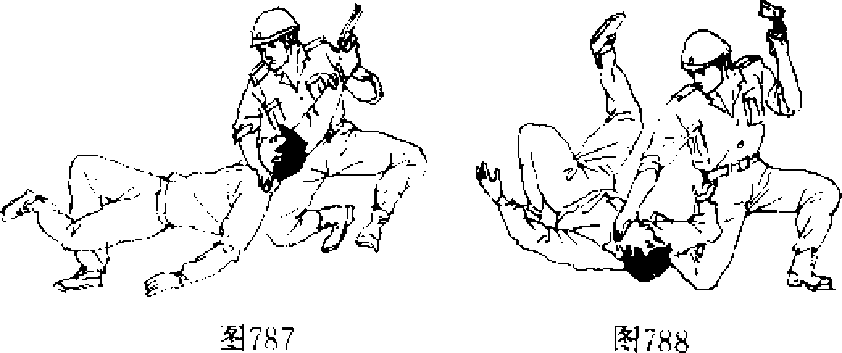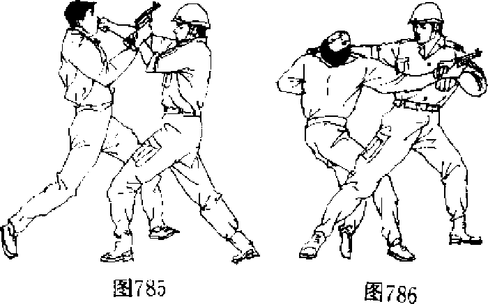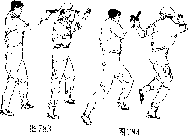 投降以麻痹敌人一旦枪口触到背上便要利用敌方扣动扳机需要近一秒钟的时间这个空隙刻不容缓地采取果断行动。首先要用举起的双手中的左手以闪电般的速度向左下方猛力挥出猛击敌人的持枪的手腕(图784)将敌枪击落或使其枪口偏离射击目标迅速挥右拳打击敌人的头、面部(图785),用左手抓牢其手枪用右手卡牢故咽喉右腿迅速插入敌人的身后(图786)然后上、下肢同时反向用力将敌人摔于体前并夺卜手枪(图787)再用左手握枪猛击其头部(图788),使故昏迷或死亡口