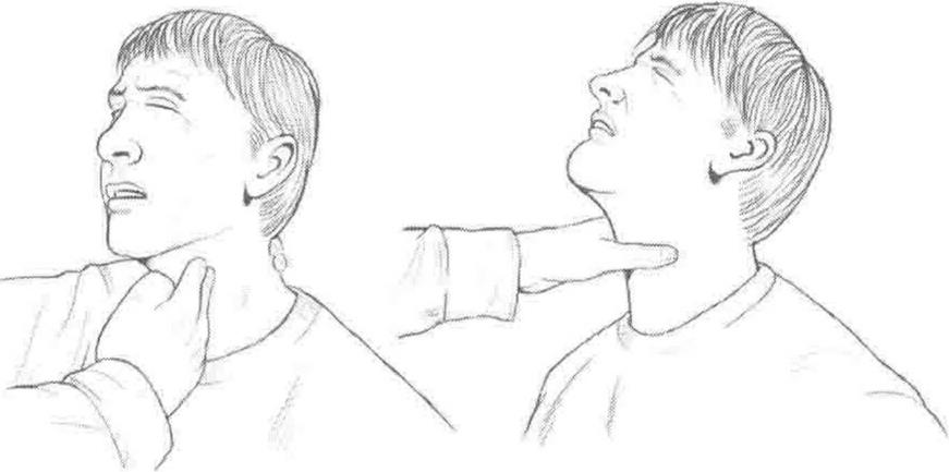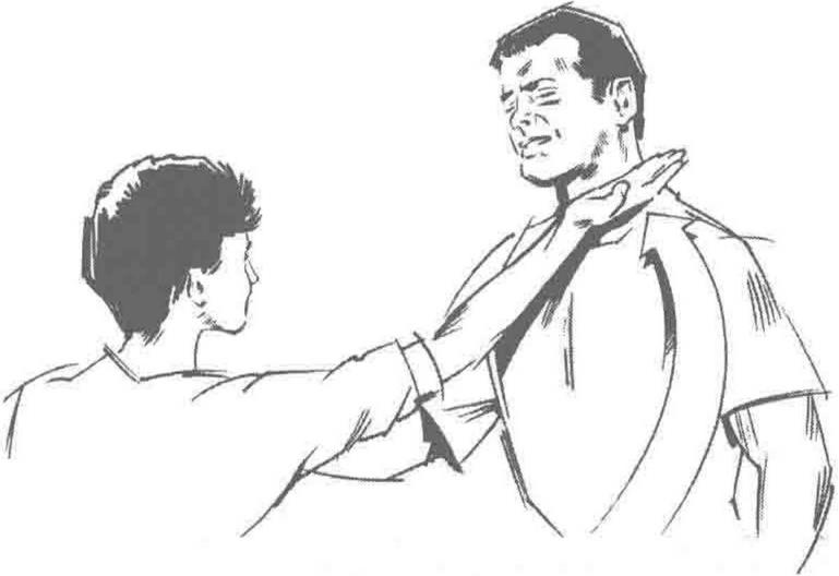 一种从正面攻击咽部的很好的方法就是践状手击打用大拇指和食指之间的虎口部位作为发力点进行击打。这一记击打足以杀死敌人或者至少可以使他出现暂时性的呼吸困难。手指绷紧伸直的长矛手直接戳击喉结旁边的颈动脉窦(咽喉部位和颈部肌肉之间柔软的区域保护颈部动脉)也会起到同样的击打效果。