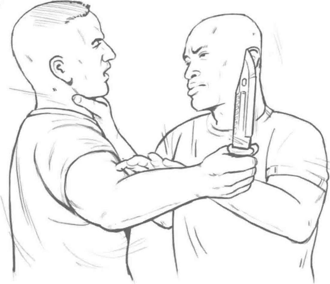 士兵可以趁此机会锤击敌人的鼻梁或者用膝部撞击他身体的柔软部位还可以对他实施扭倒抱摔技术。无论是在对敌人实施扭倒抱摔的过程中还是在他倒地之后以及对他进行猛烈击打的时候士兵一定要保持对敌人所持刀具的控制避免自己被刀刺中这是非常重要的。