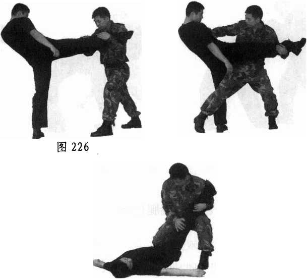 动作要领1敌右鞭腿向我上体踢来时我左闪步的同时左抄抱其脚踝或小腿(图226)2右腿猛绊敌左脚后跟,同时右掌猛推敌右胸身体左转将其摔倒(图227)3右膝向前下跪击敌裆部将其制服(图228)。图228要点抄抱准跪击狠推胸、绊腿要一致。