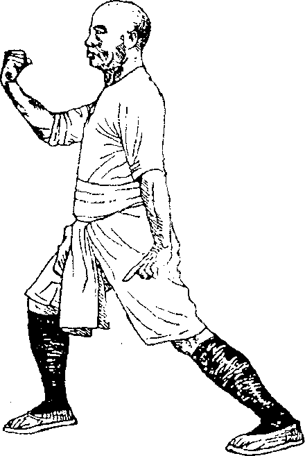 【图解】 承上式。马转右弓左箭子午势,同时右拳.向 上一抽,左掌向下一按,口出“口的” 一声(如图);接着再 口发“响” 一声,原势不变.