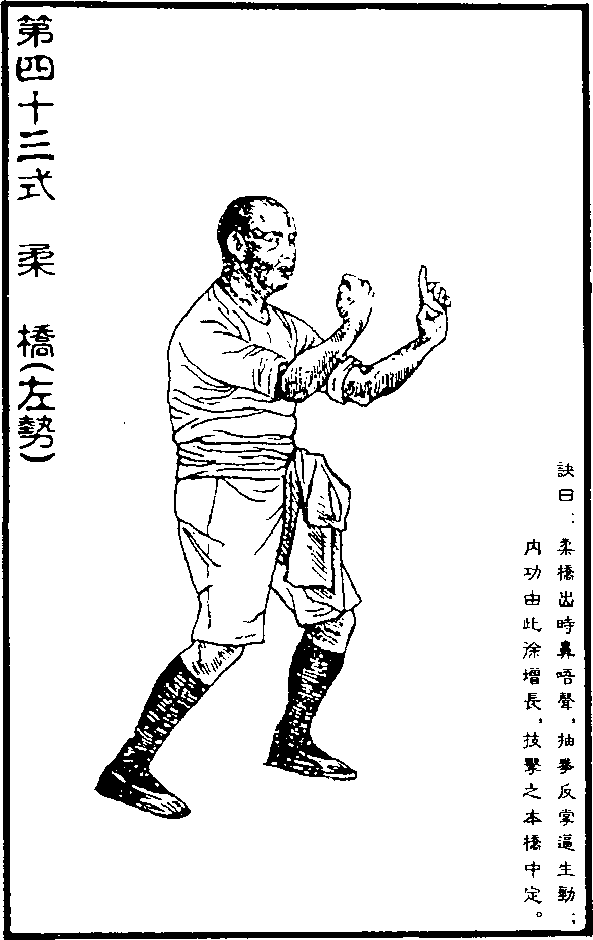 诀曰:订桥一势手抽提,飞腊变来势雄齐; 掌指按沉生暗力,子午马转敌魂迷。
