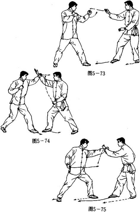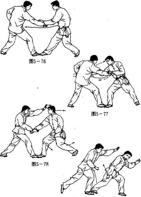二人对峙开门对搏势(?图5-73),我匕右步向敌靠近一 步,左脚跟上一步,右手仰掌向敌头部上击去.敌左瞥上抬,以 小皆外架我攻手(图5-74);敌左臂上架后,立即突然改变为 直冲拳向我头部打来,同时其左脚向我进半步。我急起左臂, 以小臂内侧格挡来拳,同时身体回坐,右步后撤半步(图5~ 75〉;我格挡来拳后.乘敌收拳之机向前上右步、跟左步朝敌遍 进。敌向后退左步,并虚发右拳对我小腹打来。我以左手下落 拍按敌右小臂〈图5-76);我左手下拍之同时打出右钻拳,向 敌腹部打去,身体下蹲成马步(图5- 77);敌急速回带右臂, 以右手横拍我右小臂,化解我拳劲,同时敌以左手由后向前朝 我头部推掌击来(图5 — 78),我见势?不妙,速向左后拧身转体 180。,两膝同时左撅转,身体下俯,快速以右脚由F向后向上 摆撩踢腿,踢中敌前倾身体的卜怀(图5-79.图5—80)。