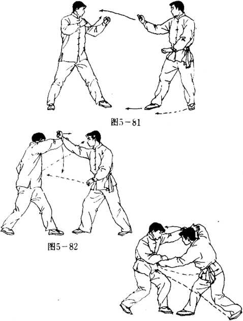 二人对峙如图所示(图5-81).我向敌身前先上右步,再 跟进左步,用右斩首拳向前引手对敌而去。敌向左拧身.抬起 右臂,以小管外侧架我手(图5-82);敌架我手后,用左拳横 摆揽击我右侧头部。我右臂向右带动搂挂敌之左拳,同时以左 拳向敌腹部直钻。敌右臂下落向外拨拍我左拳(图5-83);我 右手由搂挂改变为向前直探踏掌击向敌头部,同时左脚由后 向前弹起踢向敌挡下。敌急以右手搂拍我脚.上身后仰避开我 之右踏掌(图5—84);我脚乘敌手下拍之势向敌身前跨落,同 时以左钻拳直向敌腹上打去,敌无法招架而败(图5-85).