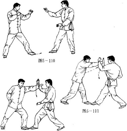 敌我双方以对搏之势相峙(图5—110)。敌以右脚前进一 步,左脚跟上半步,用右直拳向我面门打来。我右脚前迈半步, 左脚跟半步,屈肘上抬左臂,以小臂格挡敌拳(图5-111).我 左臂由左向右下划圈,将故右拳劲力化掉。敌收回右拳.再以