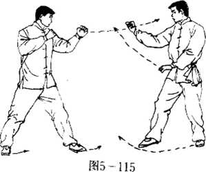 (2) 化掉敌左拳劲力后.要乘敌左拳未收之时,右拳未发 之先,打出我之钻拳,此招才能见效。