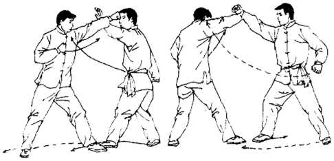 (1) 敌连续发直拳攻我,我以左右带环化格故劲,应注重 ■化”字是要以柔克刚,而不是硬挡硬格.