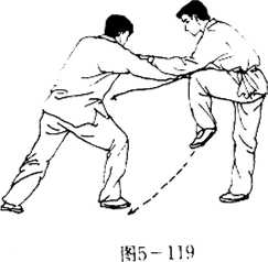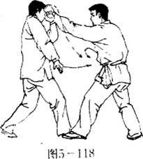 敌我双方各以对搏之势相对(图5—115)。敌上左步跟右 步向我遍近,并以左直拳向我面门打来。我向右斜前方绕上一 步,左手由右向左绕臂,以掌腕根部比开敌拳劲(图5-116); 然后我上右步靠向敌方身前,右手握拳直打敌头右侧。敌见我 拳打来,速退右步用左掌上搂我拳(图5-117);我双脚齐动, 左脚向前右脚向后,拧鞭搓步转身.同时左拳直打敌头。敌左 曾屈肘上举,用小臂上架挑开我拳(图5-118);敌挑开我拳 后,苴即向前探身用右手拳背向我小腹裆F撩来。我速提左腿 并使左手下滑抓敌肘,右手前伸抓敌腕,两手同时用力向回捋 带敌臂(图5- 119);接着,我左脚向前跨落,左手滑抓敌腕不 放?并继续向回捋带,右手握透骨拳向前直攒打击敌腹(图 5-120).