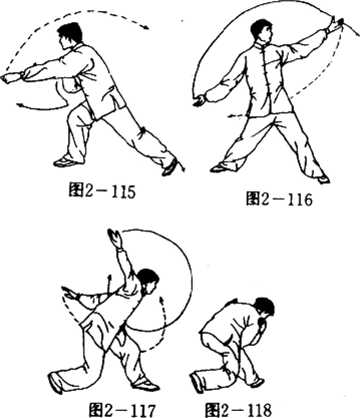 右腿屈膝前弓,左腿在后蹬伸,脚跟离地,上身向右侧前 俯,左臂向右侧前方伸出,掌心向右后,右臂屈肘置于左肘窖, 目视手前方(图2 —115);左脚跟踩地,右腿伸直,上身左翻后 仰,髓部前挺,左臂向上向左抡起至左斜上方,右曾伸肘向下 经右腿向右后展开,头后仰左转,目视左手(图2-116);左腿 屈膝下蹲,右腿屈膝向左旋蹲,上身向左翻转俯腰,左臂由左 斜上方经左下向左后摆抡、至身后.右臂随身体翻转,留臂不 动,充分展开,置于右侧上方(图2 — 117);两腿继续旋蹲成高 歇步状,臀部下降,两肾由后向前胸合抱,左手-在上击至右肩 后,右手在下击至左肩后.凹胸、凸背,低头目视右卜?方(图 2 -118)。