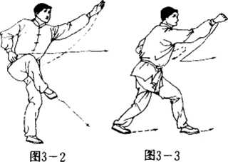 重心前移至左脚,左手由后向前做踏学?同时右脚提膝, 护于裆前?右手亦同时收撤金腰间。目前视?左手尖对准鼻尖。 (图 3—2)。