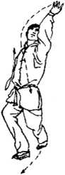 右脚向后退一步,身体保持前倾状,左拳变掌,右手后引 开(图4一69);右臂由后向前向上抡摆,再向后向下抡捽,手 心向上,力达前臂(可捧抡在左大腿内侧处);左手屈肘回收, 手经面前向下再向前屈抡臂并于右臂交拍而过,然后随右暨 抡捽之同时,左臂直臂向前上方托撩而起,力达掌心。然后左 脚向右脚后倒插步,上身后仰,抬头.目视左手上方(图4一70 及侧视图4—71).