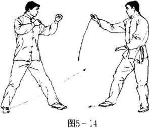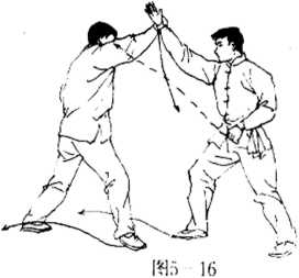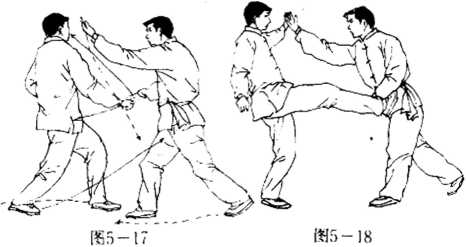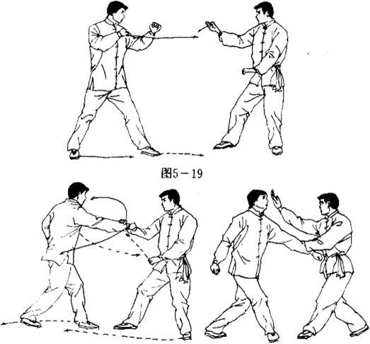 [要领]二人以对搏的准备势站立(图5-19),敌先 上左步,接着右脚跟进一步,右手握拳照我胸前直打。我右手 变掌下拍搭于敌腕(图5-20);敌紧接左脚退步,左手握拳向 我腹部冲打.我即左脚上步,左手下压拍敌腕,同时右掌由 下向前上方侬抖而出,击打于敌面(图5-21)。