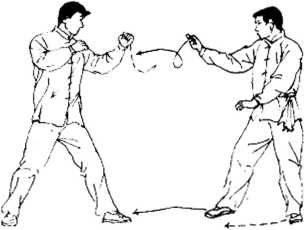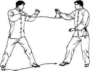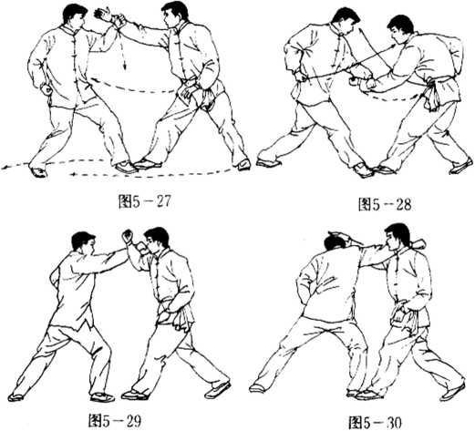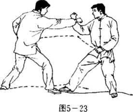 [要领]二人以对搏预备势相对(图5—26)。我左脚 上一步后,右脚再向前一步靠近敌身,右拳变掌画-圈虚晃之 后,向敌之左脸横搦。敌立即下蹲屈腿,左臂上举挡架我手(图