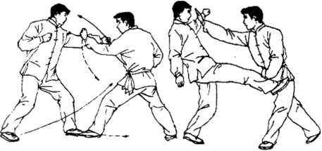 [要求]敌连续进攻冲拳,我脚上步法应灵活敏捷,于 防守中寻找敌方空隙。当敌起腿踢我之时,一般都存在门户不 严的情况,此时用一手化开敌腿,一手向敌进攻,最易得手.