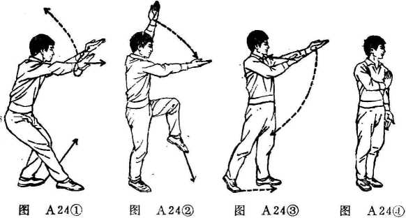 上动不停。身体重心移至右腿,左腿向前屈膝提起,脚 尖下垂。同时左掌屈肘屈腕小臂内旋,由上向下绕腕,屈肘举- 至头上方。目视右掌 (图A24②)
