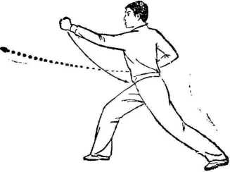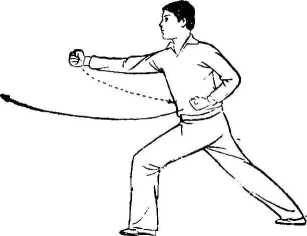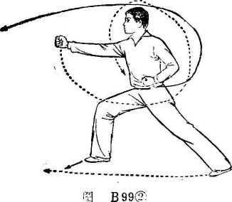 上动不停石拳由腰间向前直臂冲出拳眼朝上;左拳 由前收至腰间,拳心朝上。目视前方(图B 99②)。