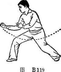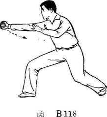 身体重心后移,左腿屈膝下蹲成半马步。同时,左拳变掌 下按经右臂内侧收至右肘部,掌指朝上;右拳由腰间向前直臂 冲出,拳眼朝上。目视右拳(图B118)。