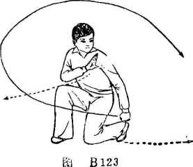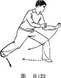 上动不停。左臂外旋,拳心朝上。同时,屈肘回收于肋 下,右掌立于左肘部。目视左拳(图B122)