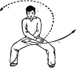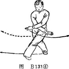 前倾。同时,左掌继续向下摆动;右掌由后向前、向下抡劈, 两掌在腹前时交叉,左掌在外,掌心朝内,右掌在内,掌心朝 外。目视两掌(图B 131④)