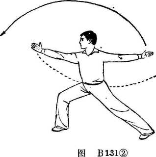 步。同时,右掌由腹前向前直臂论劈,掌指朝前;左掌向后摆 至体后。目视右掌(图B 131②)。