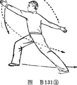 上动不停。右掌继续向下经体右侧向后直臂抡摆,掌心 朝下同时,左掌由体后向上、向前直臂抡劈,掌指朝前。目 视左掌(图B131③)。