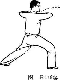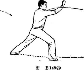 右拳向上屈肘并向左横格出,拳心朝内;左掌立于右肘内侧,掌指朝上。目视前方(图B 149 )。上动不停。右拳向下屈臂并向前顶肘,左掌附于右拳面 上。同时,右阃向前擦迪滑行半步,屈膝下蹲成右弓步。目视 前方(图B 149 )。上动不停。右拳向上、向前直臂翻出,拳心朝上;左掌 立于右肩前,掌指朝上。目视右拳(图B 149 )。要点:顶肘时,两肩要平成一直线;摔拳时,应以肘关节 为轴向前翻出;右脚前滑不离开地面。