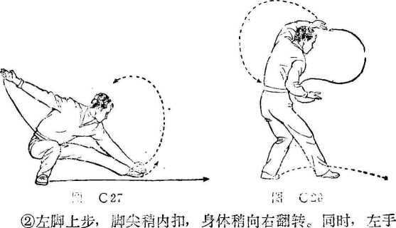 ①重心前移,左脚向左前活步,右陶立郎向左前上步。同 时,左手内旋上.架至头上,小指一飼朝上,右手经腰向前仲至 腹前,肘靠肋,手心朝上。目视前平(图C 28)。
