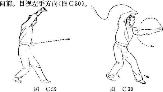 后摆收于腰间,右手贴腹部向左,再内旋上架至头上方,小指 侧朝上。目视前平(图C29),
