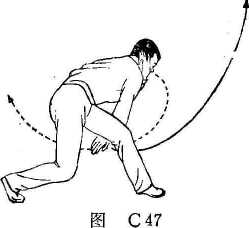 上体下压,含胸收腹坐臀,带动两臂用力交叉,即左手 直臂下劈至右大腿处贴紧,手心朝外;右手向上挂至左耳侧, 手心朝处。目视前下方(图C50)。