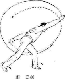 上动不停,上体向右翻转,带动右手向上向右,左手向 下向左一起抡转划弧近一周,左手至前上方,右手至后下方, 两臂呈斜平。同时,以两脚前掌为轴向右转成右双弓步。目视