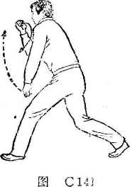 朝外;右手变拳,屈肘回挂至面前与鼻平,拳心朝里。目视前 平(图 C 141)。 一