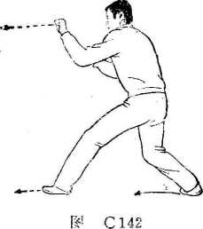 左手向上屈肘抬起,与限同高,拳心朝前;右拳内收至 左肘内侧,拳心向前。目视前平(图C 142)。