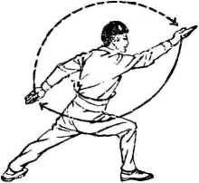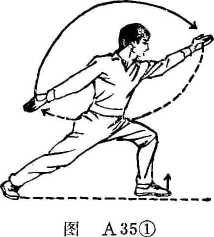 上动不停。左脚尖外撇;右脚向前上一步,屈膝成右弓 步。同时,左掌下落摆至左体后拇指一 侧朝下;右小臂外旋由 后向上、向前弧形直臂绕至头前上方,掌心朝上(图A 35②)。