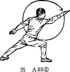 上动不停。右小臂外旋向下经腹前向左、向上、向前直 臂绕一周抡劈,高与头平,掌心朝上。目视右掌(图A35⑧)。