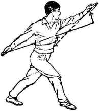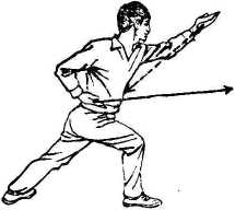 上动不停。右掌由后经体右侧,小臂外旋,向前直臂横 砍,高与头平,掌心朝上。同时,左掌收至腰,掌心朝上。目
